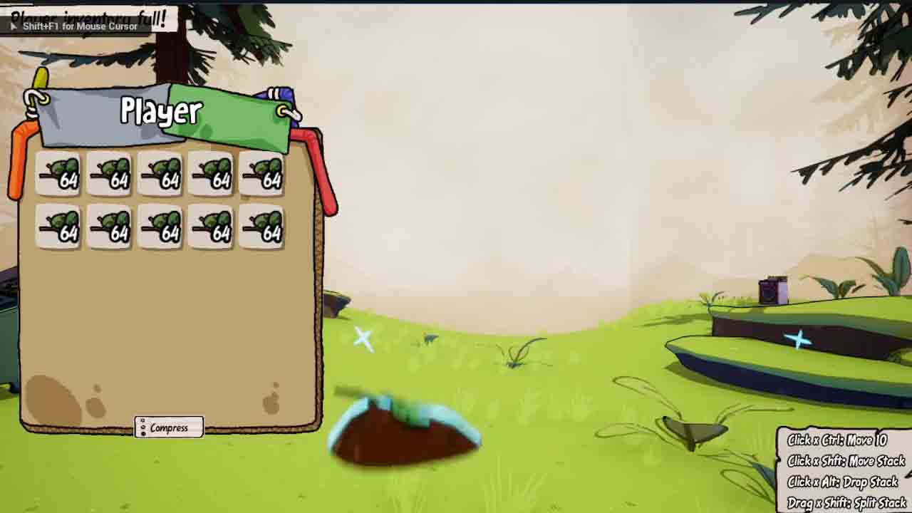 Besides storing items, inventories can also transfer items to other inventories. The player can also move, split, drop and compress their loose items into stacks for better inventory management. Some items such as batteries have their own intrinsic state which forces them to only be stored with a stack size of one.