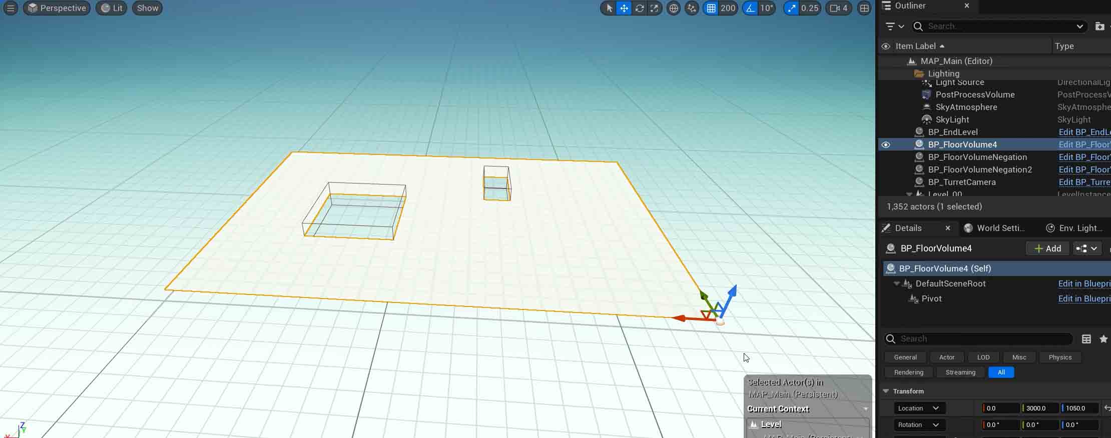 To facilitate faster level prototyping and iteration, I created a few level building tools. The first of these was a floor generator that filled in a volume with a grid of floor tiles. I expanded this to be able to set any arbitrary tiled mesh, allowing it be be used to make the game’s ceilings as well. Since we need to add gaps to the floor and to the ceilings, I added another volume that worked with the floor tool to punch holes into the generated plane of tiles.