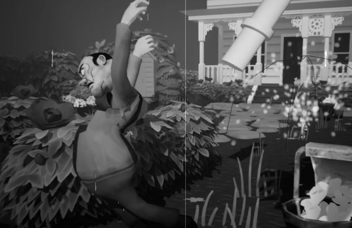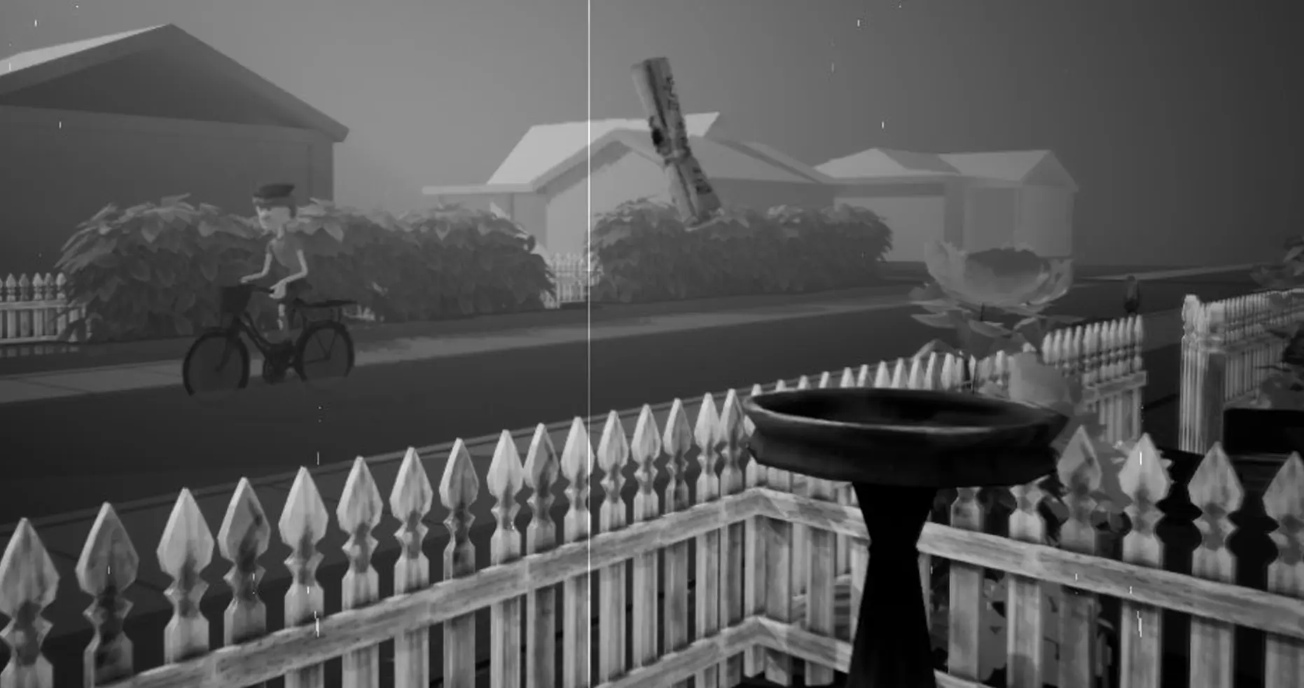On a road outside of the explorable map a paper boy continuously loops by the house, throwing a newspaper roll into the garden. The boy always tries to throw the the roll just above the bird bath, so by possessing the bath its possible to direct the place at which the roll is thrown to potentially have it hit the target character or trigger the bee hive. Water sources such as the fountain can be put in an electrified state when in contact with a source of electricity such as the eel.