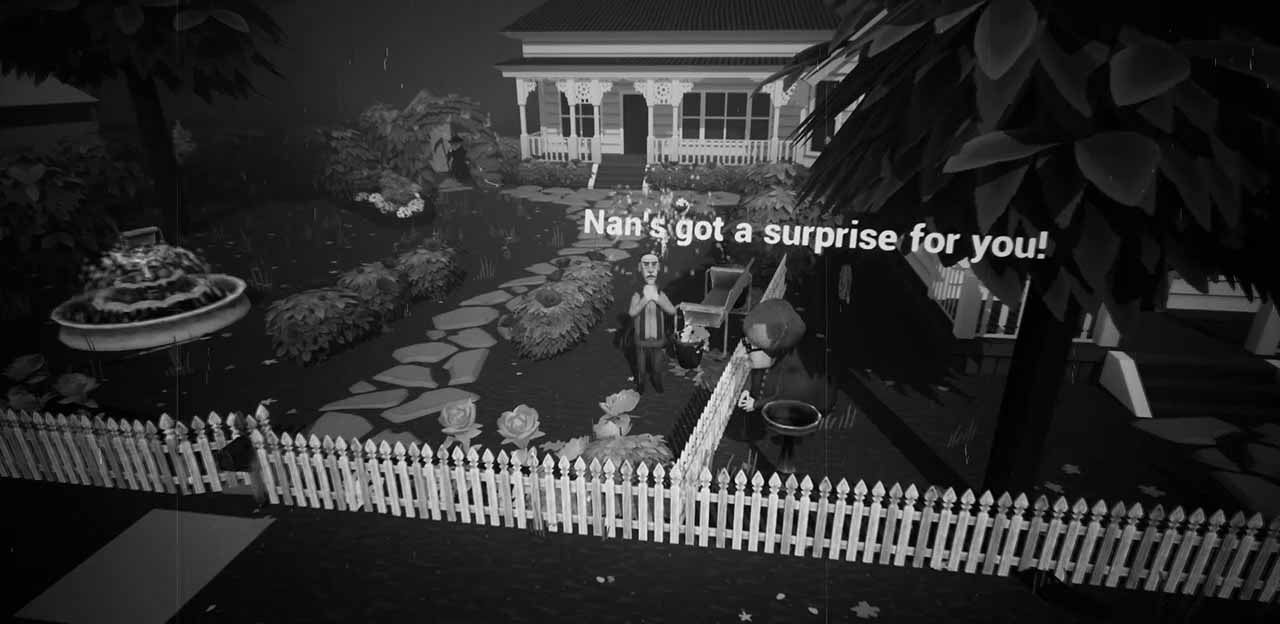 The neighbouring grandma character introduces a mechanic that provides players with a way to trade one object for another. These trades can be inferred by reading the lines that she speaks, which uses the same text system as the target character. To initiate a trade, the player can possess an item and leave it unpossessed by the fence next to the grandma. After a delay the item will be swapped out with the trade. This way, the player can trade items like newspapers for cookies, or rat poison for suspicious cookies which may have adverse effects on one’s health.