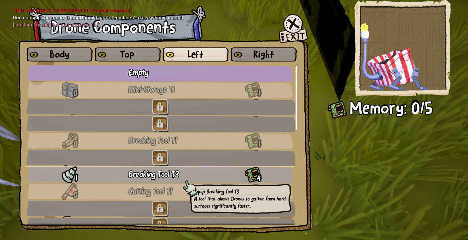 I wrote a small system that populated the reward chests in the level with these recipes, and even programmed the animations shown in the video using control rig. Components have effects ranging from increased harvesting speed to improved storage capacity and can only be equipped to certain slots such as tools being limited to arms. Each component also has a certain memory cost which forces the player to make tradeoffs between their drone's strengths. For instance, a drone may gather extremely fast but have very limited storage capacity.