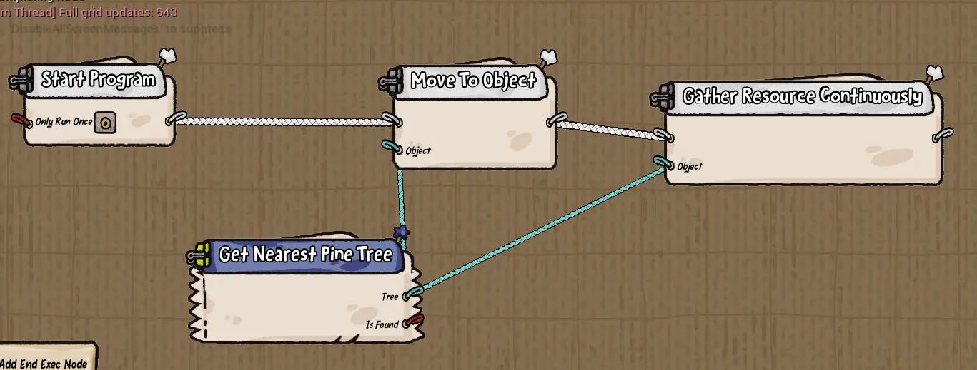 At the core of our game is the player's ability to program the drones that they find in the world, enabling them to perform different tasks. This is done using a visual scripting language with which the player can pass in data such as a 'Target Object' that can be acted upon by an action node like 'Move To' to have the drone move to that object. Only by automating their drones to cooperate with each other will players be able to solve the problems of this polluted world.