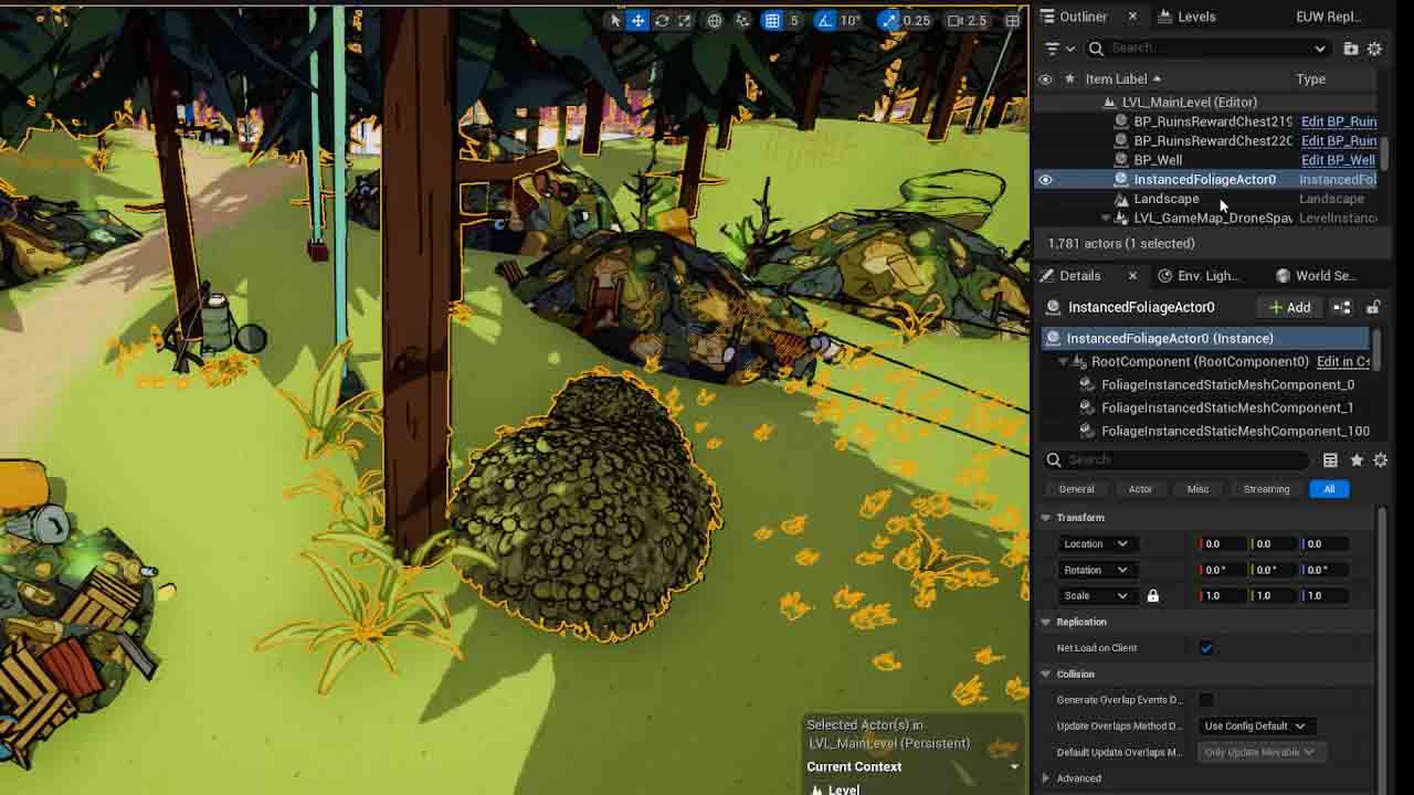In order gather resources, players and drones find and interact with objects like rocks, bushes and junk piles. As our map grew in size and we added more and more resource actors to the world, these additions began to adversely affect the game's performance. To resolve this, I put together a system that allows our level designers to place such objects as instanced foliage in the level which can then be invisibly swapped for their blueprint actors once interacted with (along with some tools to convert already placed actors to abide by the new system). These actors are then converted back into their foliage instances after a period of inactivity.