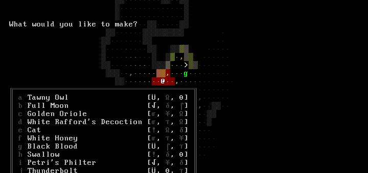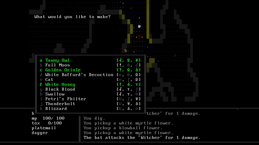 Two of the systems directly inspired by The Witcher are the player’s options to cast magical signs and concoct consumable potions. To aim the signs, a targeting system was implemented, using asterisks to label affected tiles. Signs like Aard and Igni affect a cone extending from the player while Axii must specifically target an entity. The alchemy system allows the player to brew Witcher potions from the flora and parts taken from slain creatures. With each new game, the recipes for specific potions change but their effects when imbibed remain the same. To help collect matching ingredients for potions, the potion crafting menu labels the ingredients that are missing, and highlights completed recipes.