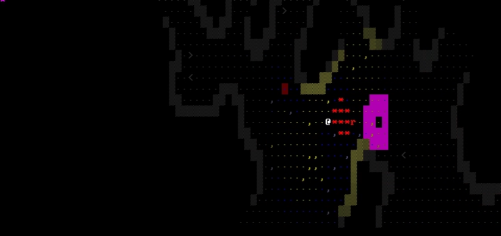 The dungeon is constructed from a series of randomized and interconnected floors. The layout of each floor is determined by randomly populating the level with wall tiles and then smoothing out the tiles so that the level has continuous regions of wall or empty floorspace. To connect the floors, each independent region of floorspace is identified and then the layers are vertically stacked to determine where there are intersections between overlapping floorspaces. A stair tile is then placed at an intersecting coordinate to allow the player to transition between the two floors. Using another smoothed level, water tiles are placed using the floorspace of the temporary level as a mask. The floors are then populated with items and entities including the player at the surface and the objective down below.