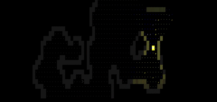 Graphically, Gwynbleidd inherits the genre’s minimalist ASCII tile aesthetic in which all objects in the world are uniquely portrayed by a text character on a grid. To render the world, I used Trystan Spangler’s AsciiPanel which simulates an ASCII terminal display by mapping a symbol, color and background to a displayed tile. Since a floor is bigger than the viewport, the window of displayed tiles follows the player as they move. The player’s visual radius is conveyed by a highlighted circle that depreciates radially from the player and can be obstructed by opaque blocks like walls. The level remains blank until explored by the player, and regions that were explored but are out of view are retained in memory as greyed out tiles.