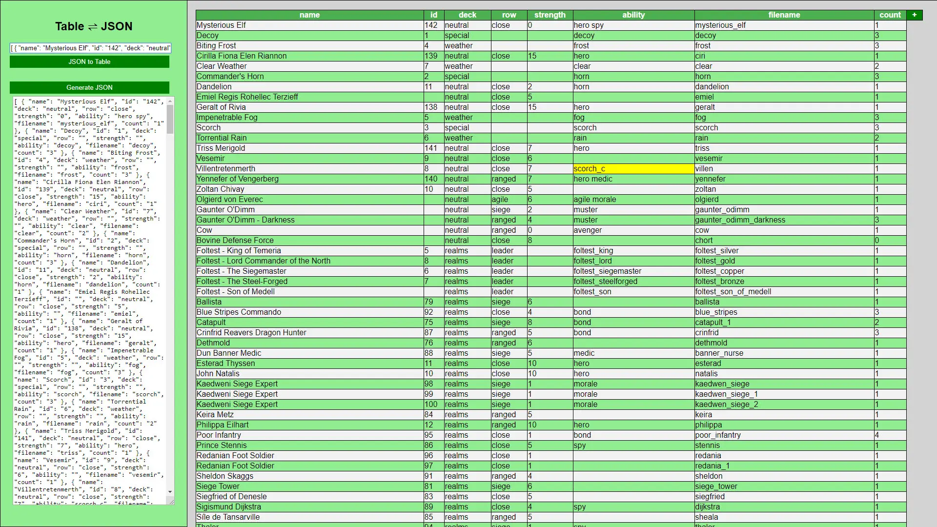 During the process of making Gwent Classic, I needed a way to store all the pertinent data for the game’s cards. I decided to store the information in json format because I could simply parse it into an object when the game loads. To accomplish this, I made an in-browser tool to log the data since it would also benefit from easily importing and exporting the json as it is updated. Such a tool would be flexible enough to modify, add or remove the information and object properties.