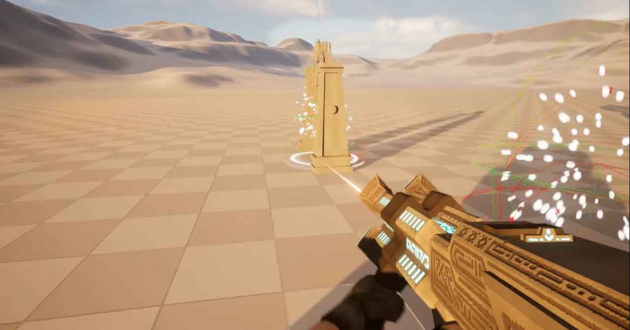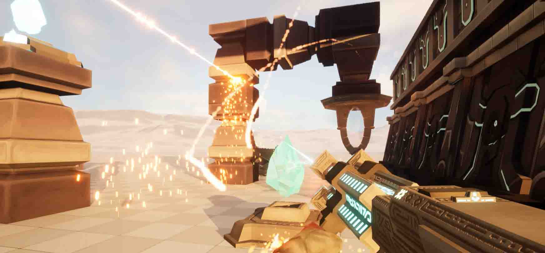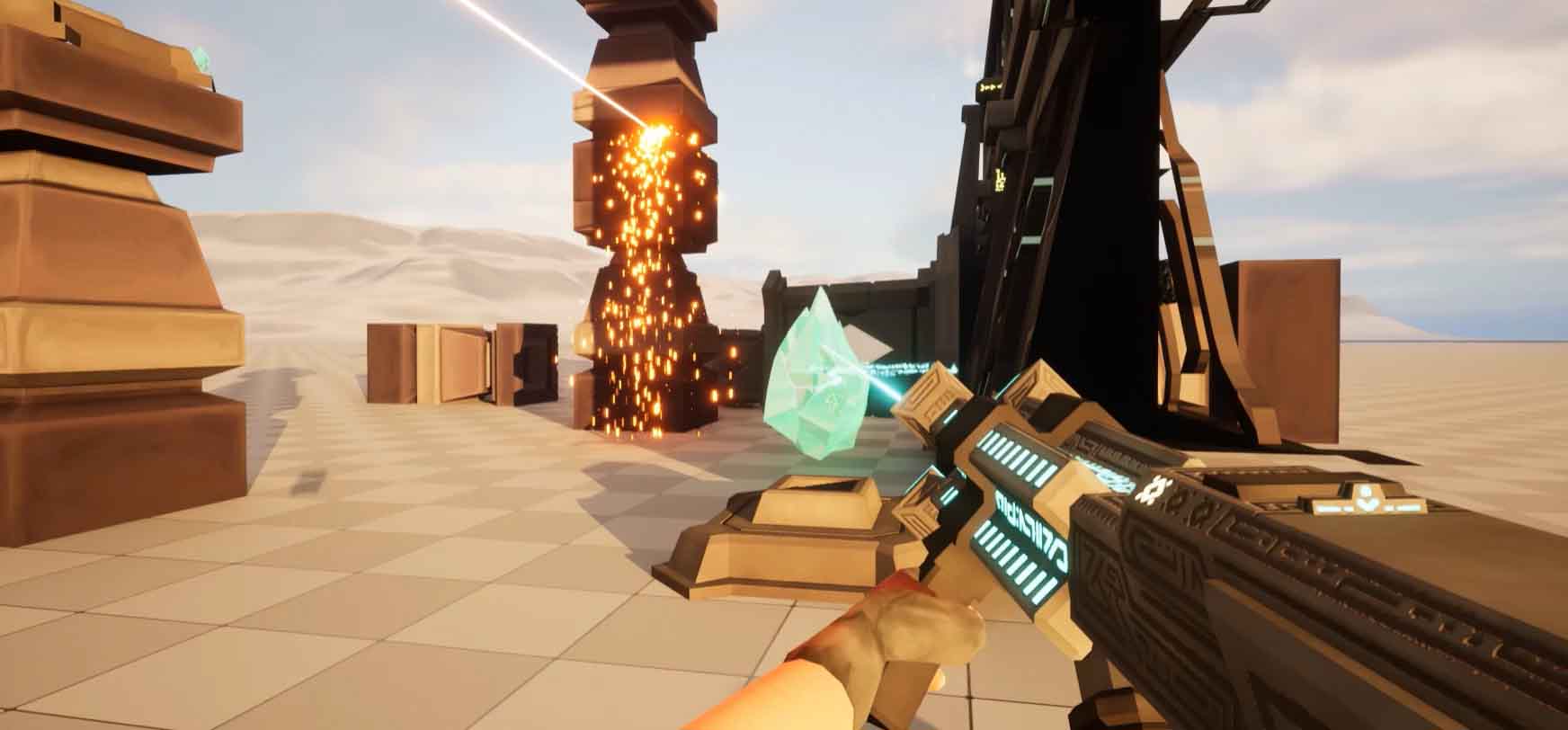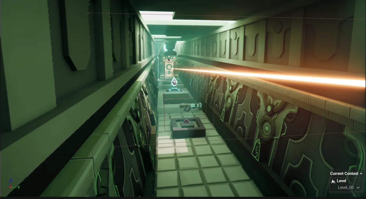 I worked on all the puzzle elements that interact with the energy gun. The gun itself can store up to three charges which are indicated via the gun’s emissives by updating parameters on it’s material instance. The only objects in a level that directly interact with the gun are crystals that, when fired on, either absorb energy from the gun or give back to the gun depending on if that crystal already had charge. These crystals can be configured to have shielding on any of their four sides, allowing level designers to fine tune when the player has a line of sight to them.