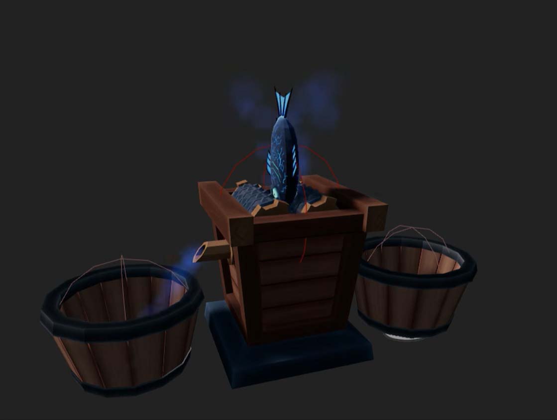 Whenever a player grabs a yellow or blue fish, they can throw it into the blender and convert it into enchanting oil. I animated the process using a timeline that rotated the blades and sucked in the fish as it gave the fish a bit of random jitter. Since we had already implemented being able to eat the fish to restore health, I had the blender spit out the consumed fish skeleton once it was done. Events on the timeline are used to plays sounds and VFX.