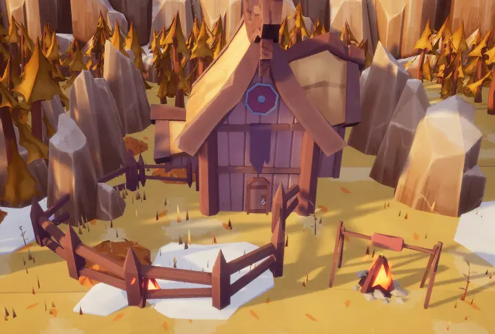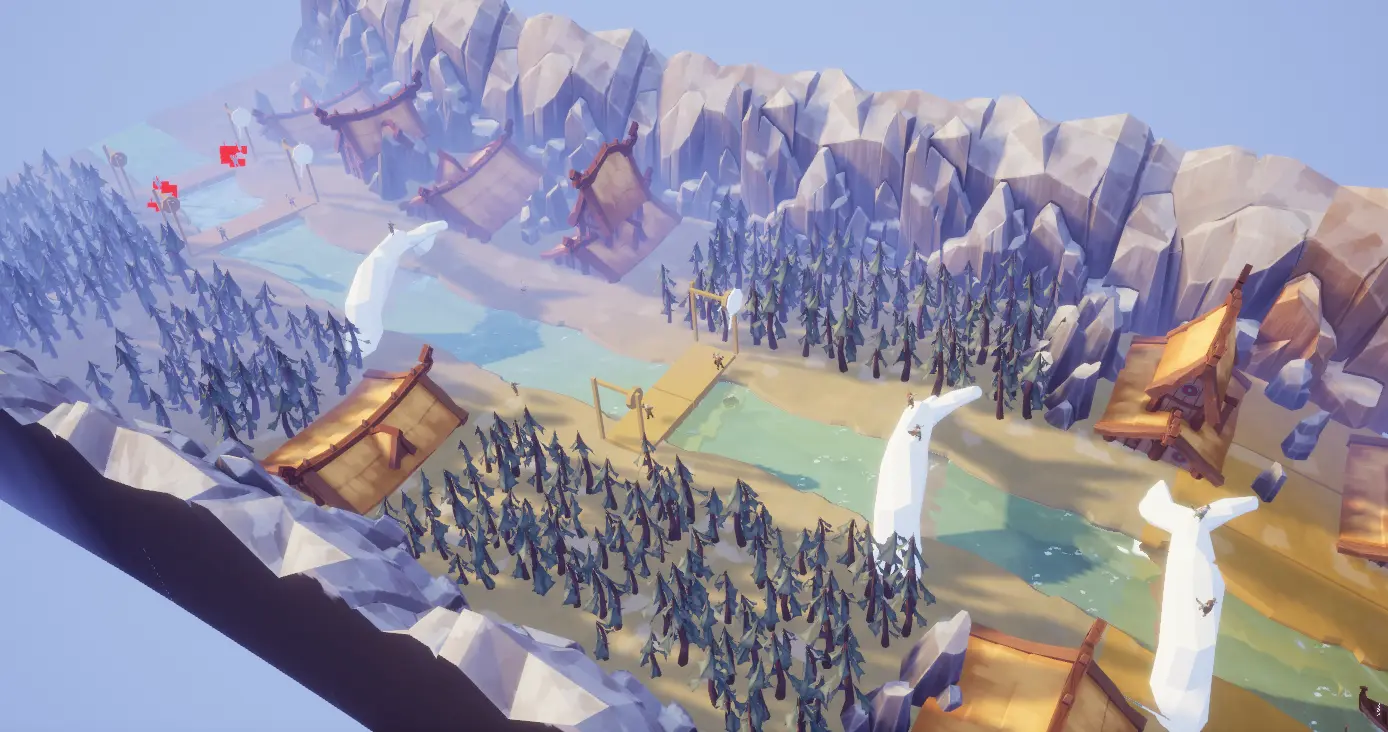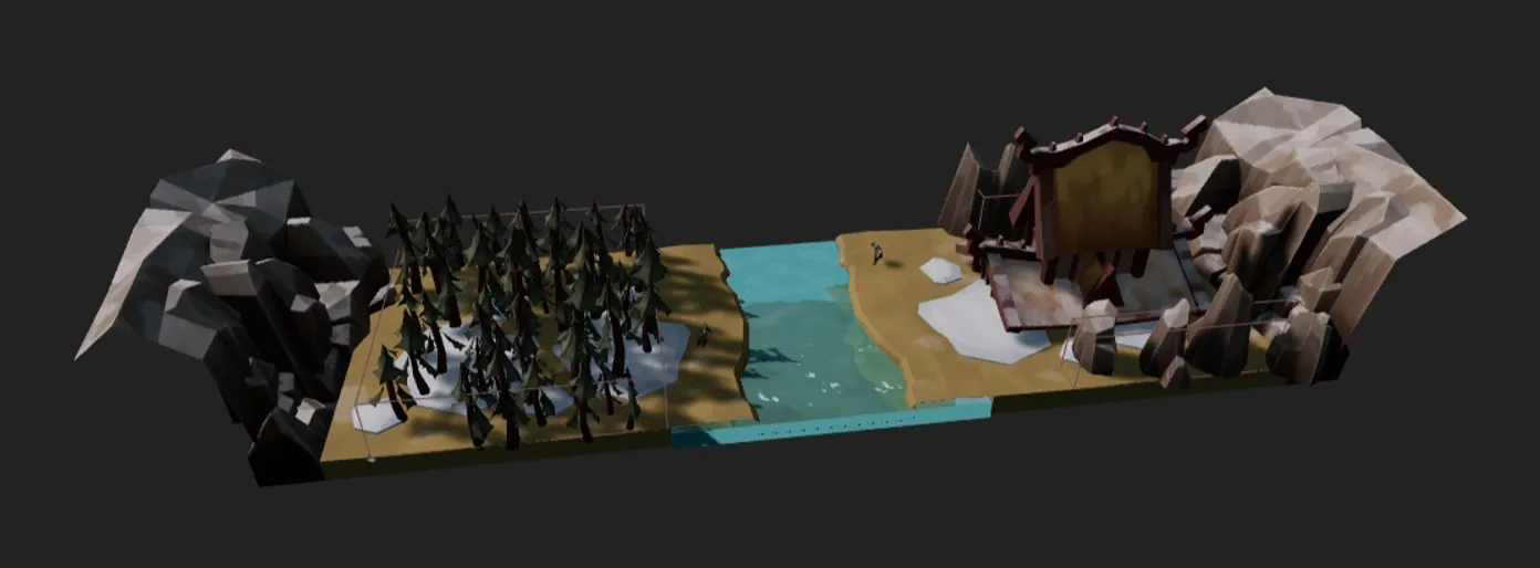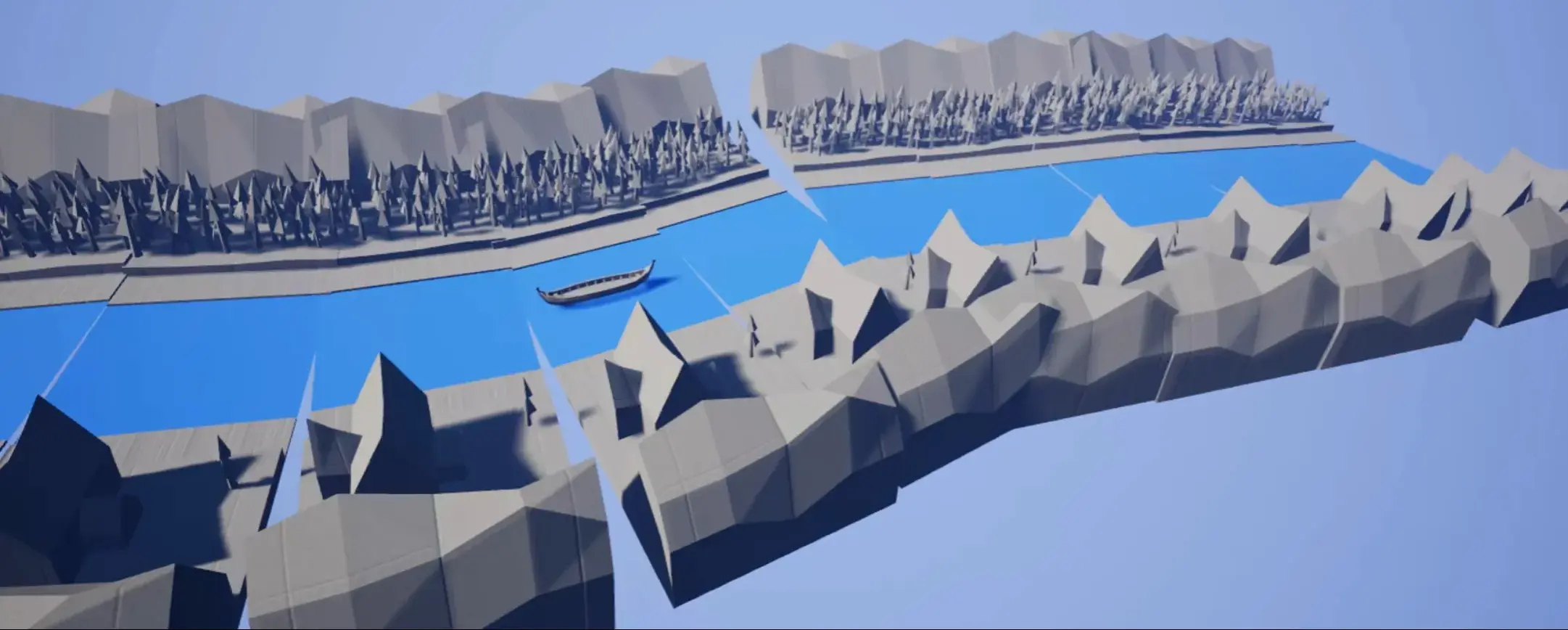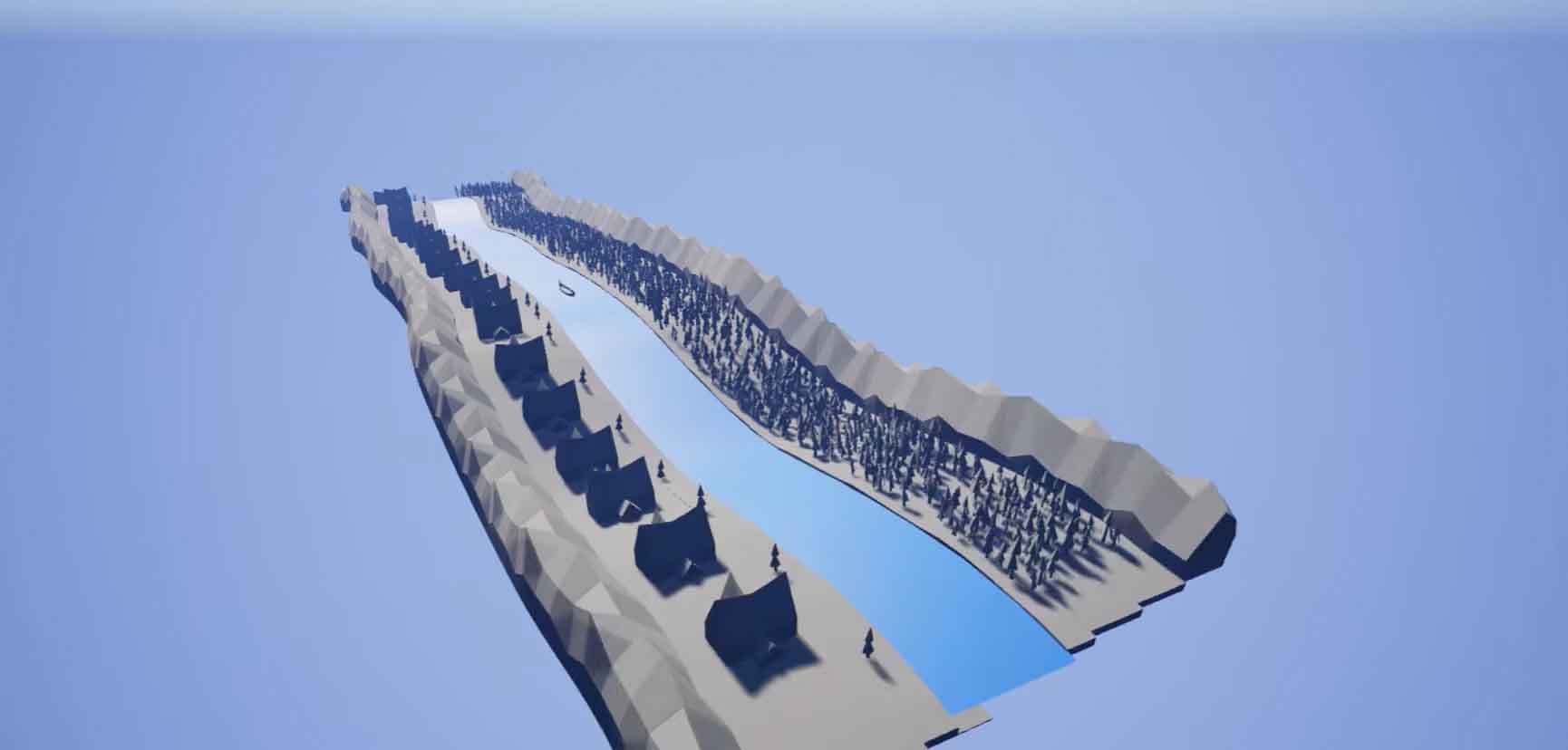 Fairly late into development we also added seasonal variations to the level. These were aesthetic changes that gave the generated river an even greater sense of variety by cycling the seasons after a certain number of segments. For most objects in the scene this just requires swapping out the object’s materials for a season-appropriate variant. Some meshes such as those for vegetation like flowers were only placed during the warmer months. Forests spawned leaf piles during autumn and most segments had patches of snow during the autumn and winter. The winter biome even has bobbing ice at the edges of the river.