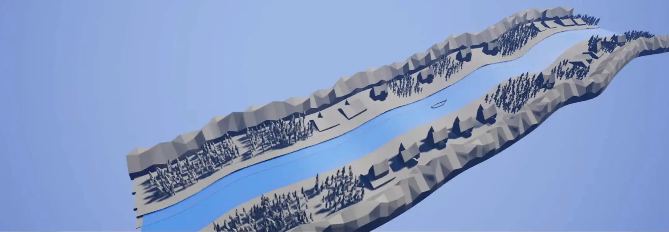 These images show some of the early prototyping stages of the river’s construction. Initially, I just got the system to a point where it would evenly place planes along the length of the spline. Once our artists had pushed some preliminary meshes to the project, I created a Segment actor that could contain all elements of a section of the river including the river’s water, banks, trees and bordering mountains.
