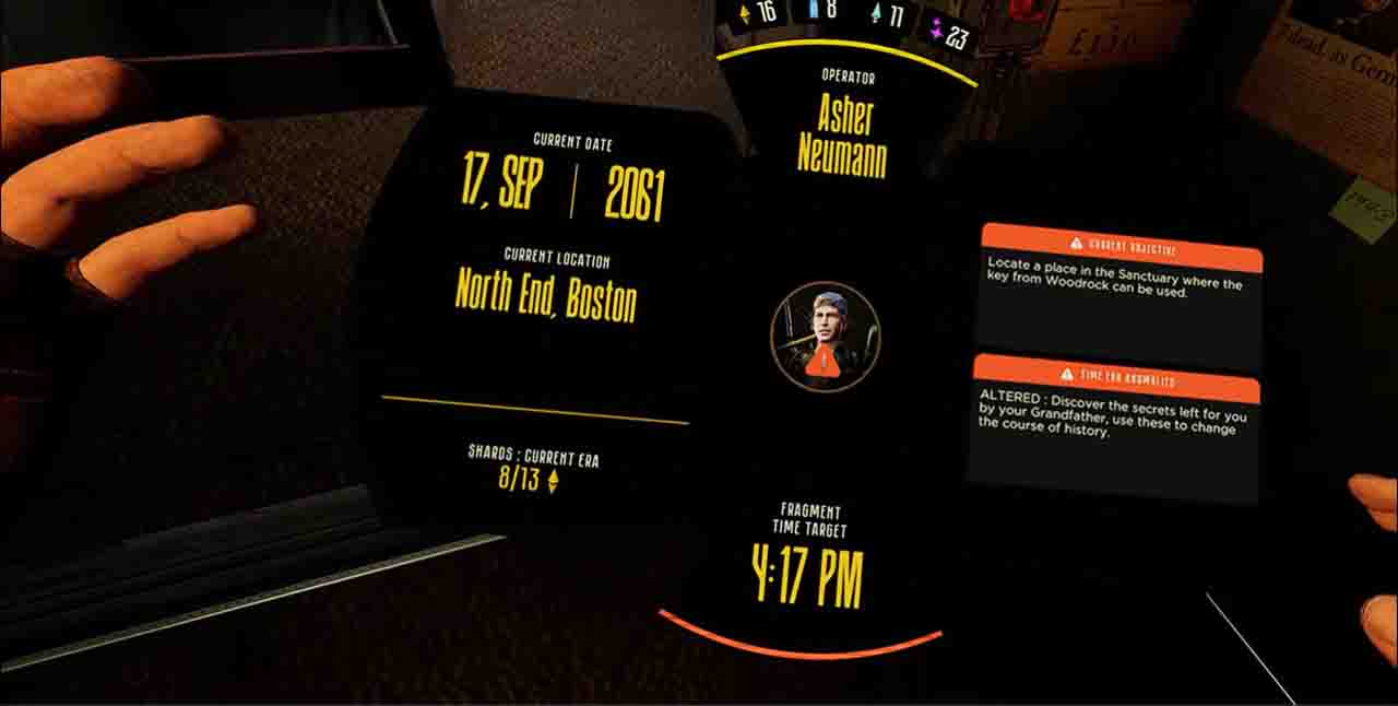 Due to my work on the hints and narrative, I gradually became the go-to dev for any narrative related questions on the team. At a certain point the designers decided that we need an objectives system for players that would compliments the existing hints. I was tasked with designing a system that could easily integrate with our existing Articy-based narrative. The requirements were that the player would have one objective that conveyed the overall goal within a particular time period, and another that was more granular and described the task at hand. My solution for the first was to have variable that could store the current state and description of the overall goal. The state was useful since it simplified localization for many of the redundant states like ‘Unknown Objective’. Updates to unique states were then just set as a part of narrative progression. For the more granular objectives I was able to piggyback off the existing hints logic by inserting code to update the text of the current objective adjacent to the most closely appropriate hint. As was the case with the watch lines I added, I wrote many of the objectives, some of which were edited and some that made it into the final game untouched.