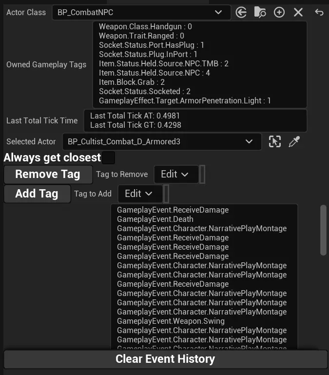 I also wrote a number of commands to help with debugging such as functions that toggled specific types of character perception, and one that killed specified character types. We also had developer options that allowed us to dynamically inject components to specified types of actors on begin play. I made some components that operated this way to show debug information for things like NPC awareness, current statetree state, and displaying damage values.